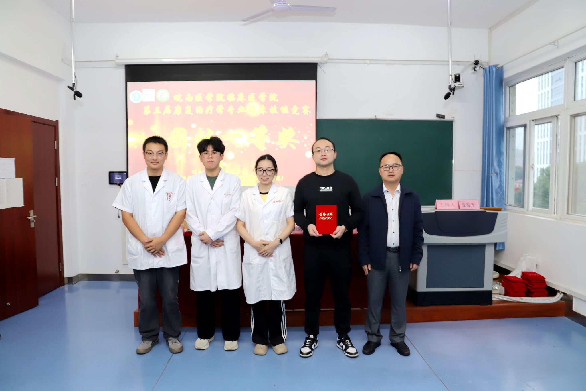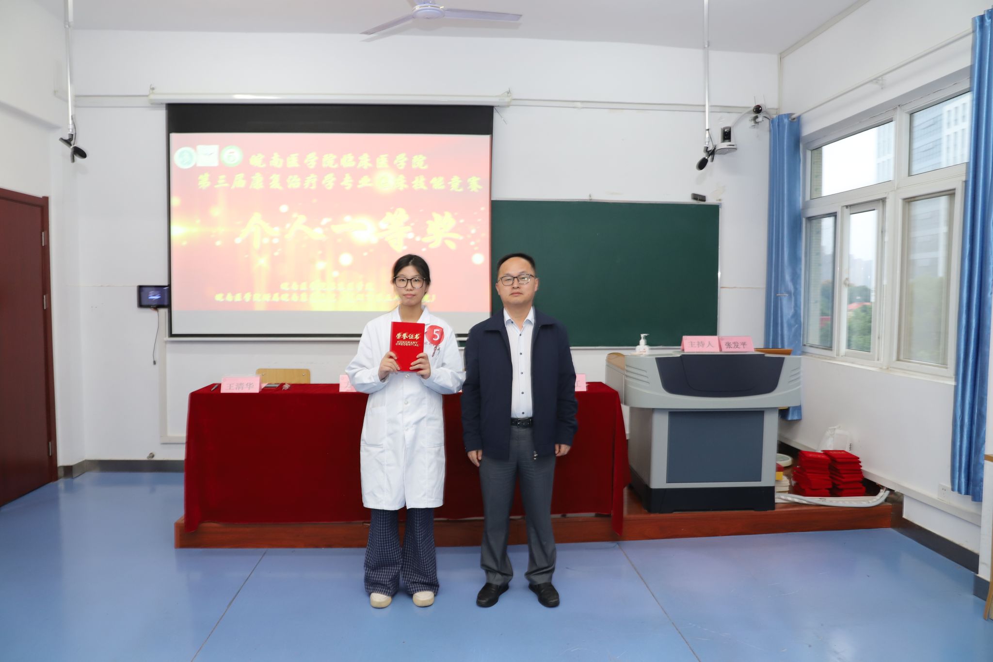 经过激烈角逐,最终符雨晴同学获得个人一等奖,韩庆楠、胡蓉等2位同学获得个人二等奖,荀美佳、高冉、张爽等3位同学获得个人三等奖;附属皖南康复医院第二代表队获得团体一等奖,第二附属医院代表队、附属皖南康复医院第三代表队获得团体二等奖,附属皖南康复医院第四代表队、附属太和医院代表队、芜湖市第一人民医院代表队获得团体三等奖;万兆兴、蒋婉云、王松、王纪涛、蒿飞等5位老师获评优秀指导教师,附属皖南康复医院获优秀组织奖。