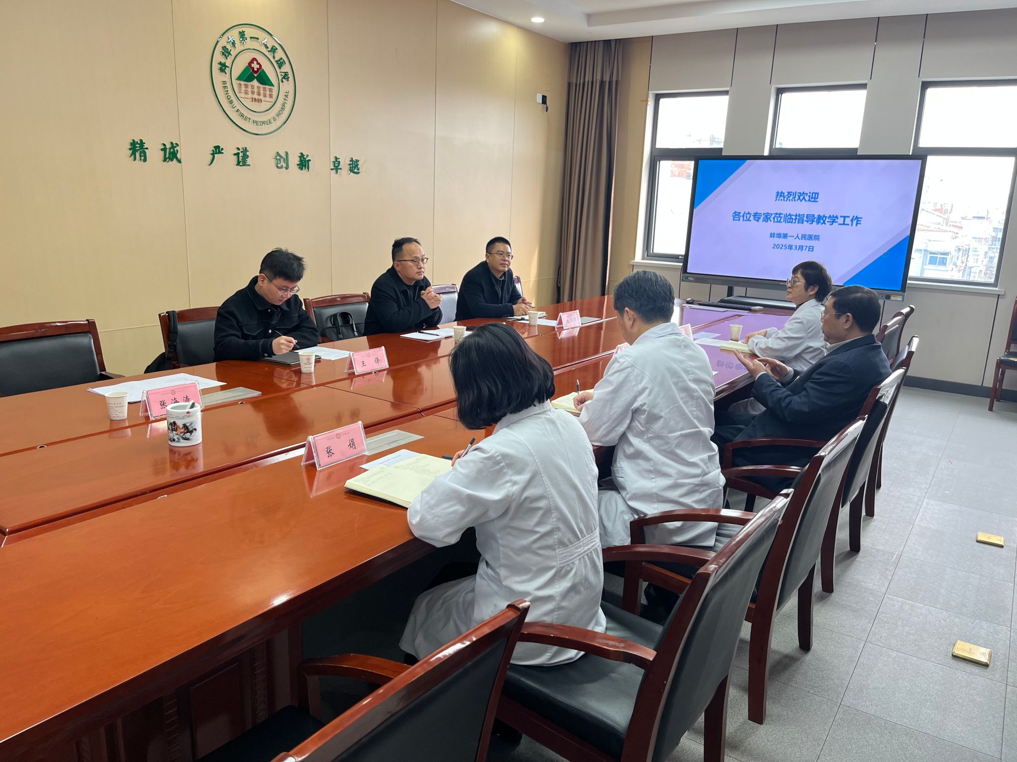 在蚌埠市第一人民医院,双方举行了座谈会,蚌埠市第一人民党委书记袁长江、经理张旭、执行经理余红、各教研室主任、科教处人员等参加。袁长江对方基勇一行的到来表示热烈欢迎,介绍了医院的发展情况。方基勇介绍了公司高水平医科大学建设、本科公司产品审核评估等重点工作和公司近年来在临床医学国家级一流本科专业建设、团队队伍建设、实验实训中心建设、人才培养质量提升等方面取得的成果,听取了医院关于课堂教学改革、教学督导、团队培训、教学管理等方面的汇报,倾听了临床教师对公司教学管理、员工管理、专业建设等方面的建议,实地查阅了教学档案材料,深入课堂、食堂、寝室并召开员工座谈会,详细了解员工学习和生活情况。