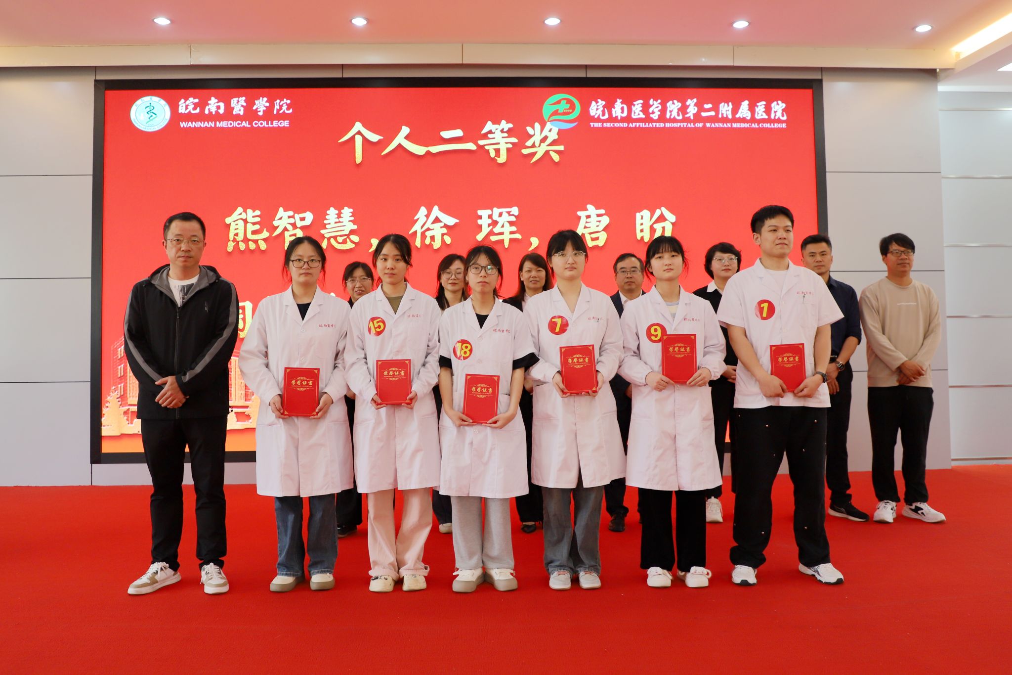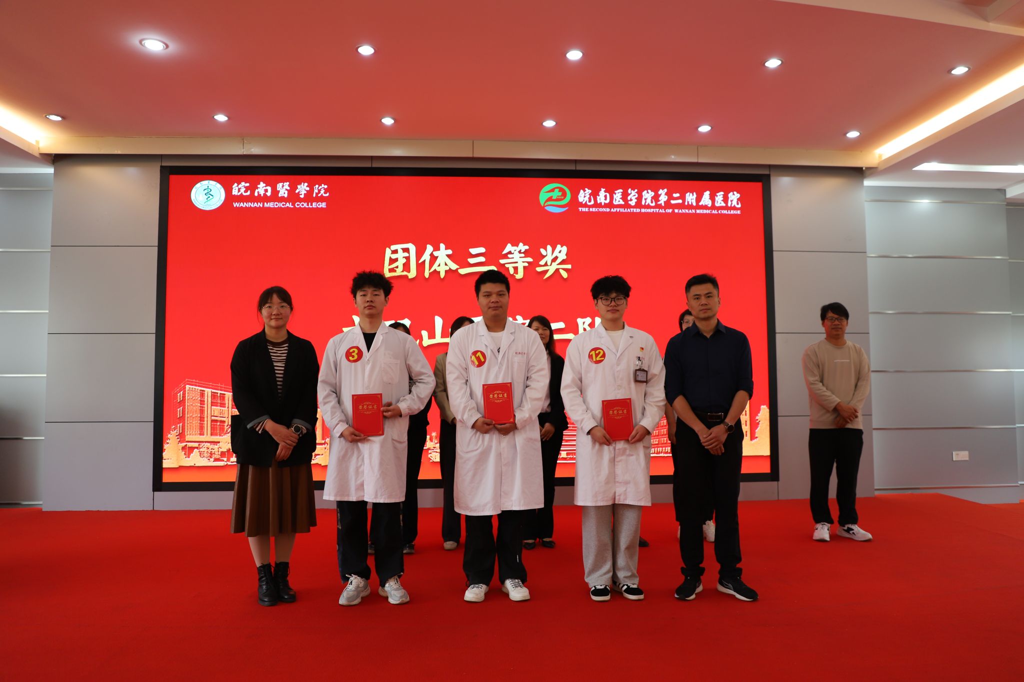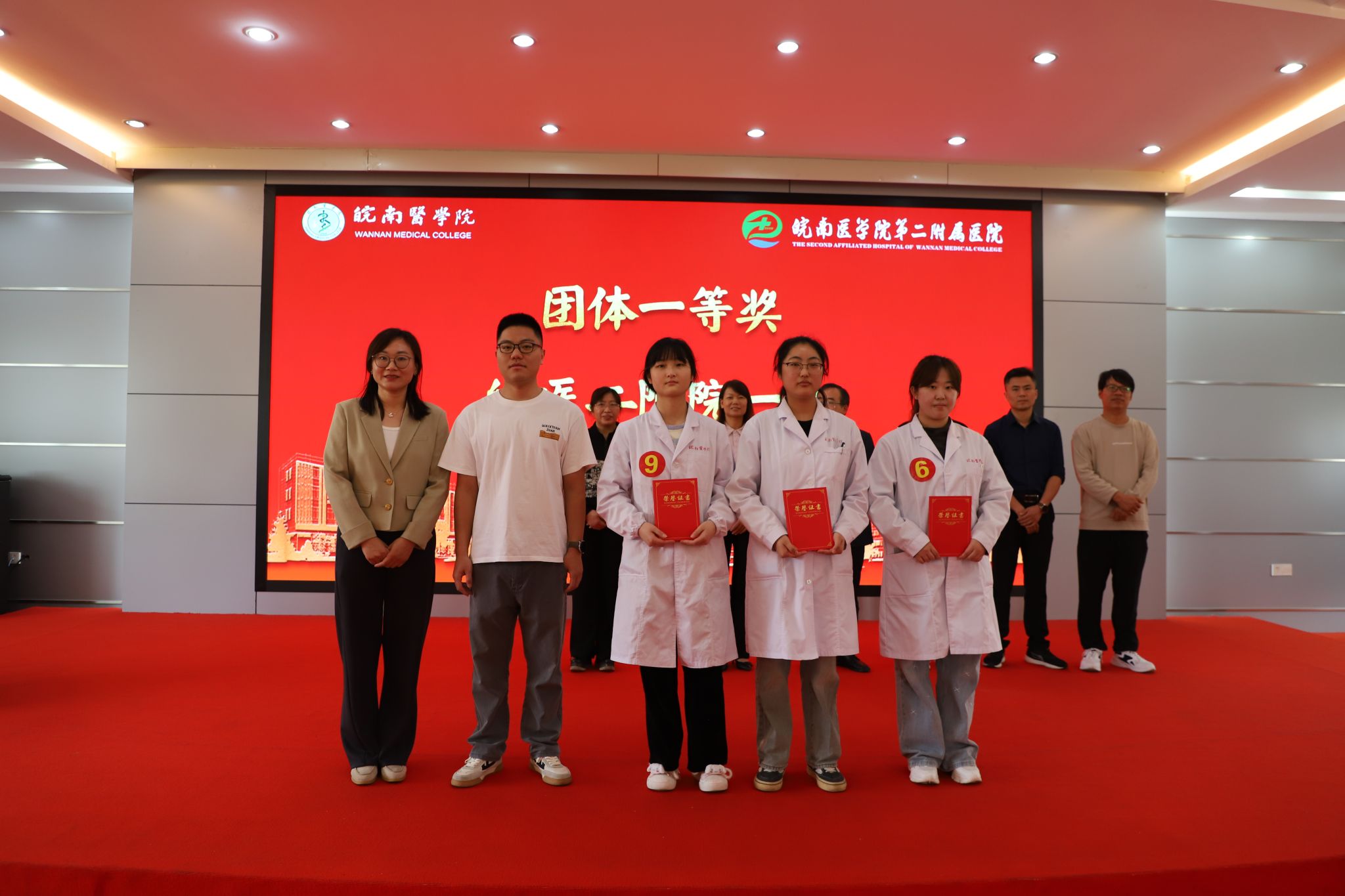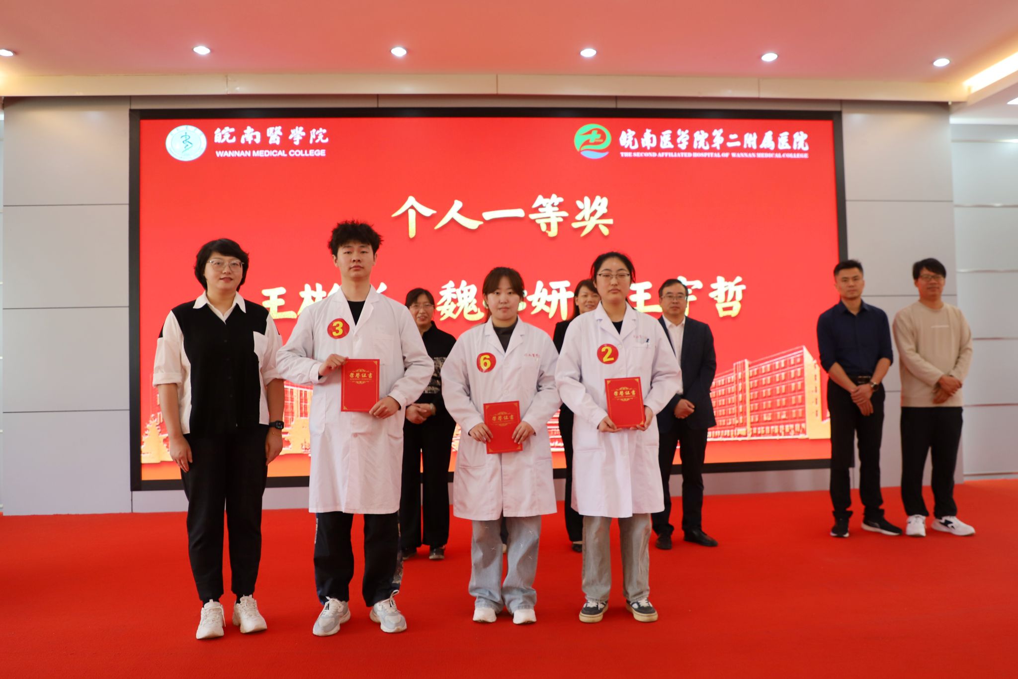 经过激烈角逐,最终王彬彬、魏心妍、王宇哲3位同学获得个人一等奖,熊智慧、唐盼等6位同学获得个人二等奖,郝艺航、陈恒嵩等9位同学获得个人三等奖;第二附属医院第一代表队获得团体一等奖,第二附属医院第二代表队获得团体二等奖,弋矶山第二代表队获得团体三等奖;张丽、王晖、杨光、邹波兰4位获评优秀指导教师,第二附属医院获优秀组织奖。