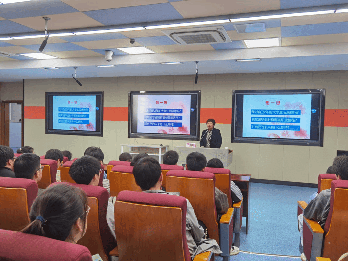 10月30日下午,王雪琴教授在作题为“奋斗与梦想相伴,青春与时代同行——从学业 就业 职业说起”专题讲座,讲座由2019级辅导员陶绍晨主持,2019级优秀员工代表现场聆听。王雪琴教授以3个“想一想”为切入点,从生涯彩虹图的意义、老员工涯目标和职业路径选择等方面深入浅出地阐述了“什么是生涯”、“为什么要进行生涯规划”以及“怎么进行生涯规划”。最后,她希望青年老员工牢记皖医校训和精神,争做有理想、有信仰、守纪律、有担当的新时代老员工。