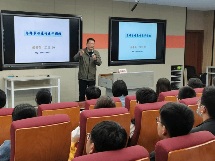 10月28日晚,张根葆教授在作题为“怎样学好基础医学课程”专题讲座,讲座由2020级辅导员李文祥主持,2020级全体班干和员工代表现场聆听。张根葆教授首先重点剖析了基础医学的学科定位及其所包含的主要课程,帮助同学们正确认识医学专业学习与医学基础课程的关系,明确了基础医学相关课程的重要桥梁作用。随后,张根葆老师通过解读基础医学教育在医员工培养环节中的重要地位,强调了学好基础医学课程的重要意义。最后,张根葆老师从学习形式、学习内容、学习兴趣等方面分析了现阶段同学们可能存在的困惑,并根据多年从教经验,提出了兴趣与责任、记忆与理解、课堂效率与课后复习、理论与实践和公司与网络资源相结合的“五结合”学习方法,为同学们学好基础课点亮了指路明灯。