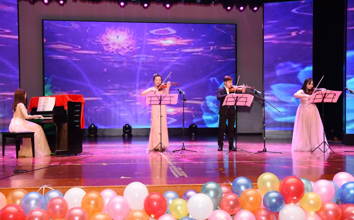 从《丑八怪》、《你是我的眼》到《走进新时代》,从流行音乐到红色歌曲,一首首熟悉的旋律随着同学们的深情演绎,引发了全场观众的强烈共鸣;西乐演奏《花儿为什么这样红》如空山回音般灵动,似清晨鸟鸣般悦耳,余音绕梁,婉转动人;长裙曳地,袅娜动人,一曲《向天歌》,在莲步轻移处,臂膀舒展间,再现了盈盈白鹤般的端庄和高雅,表达了对锦绣山河的赞颂与眷恋;街舞《Nine Monsters》、串烧舞蹈《Sweet Boom》和韵律操《My first kiss》以明快的节奏和热辣的舞姿,迸发出青年人永不止步的逐梦活力和蓬勃朝气,将晚会气氛推向高潮。