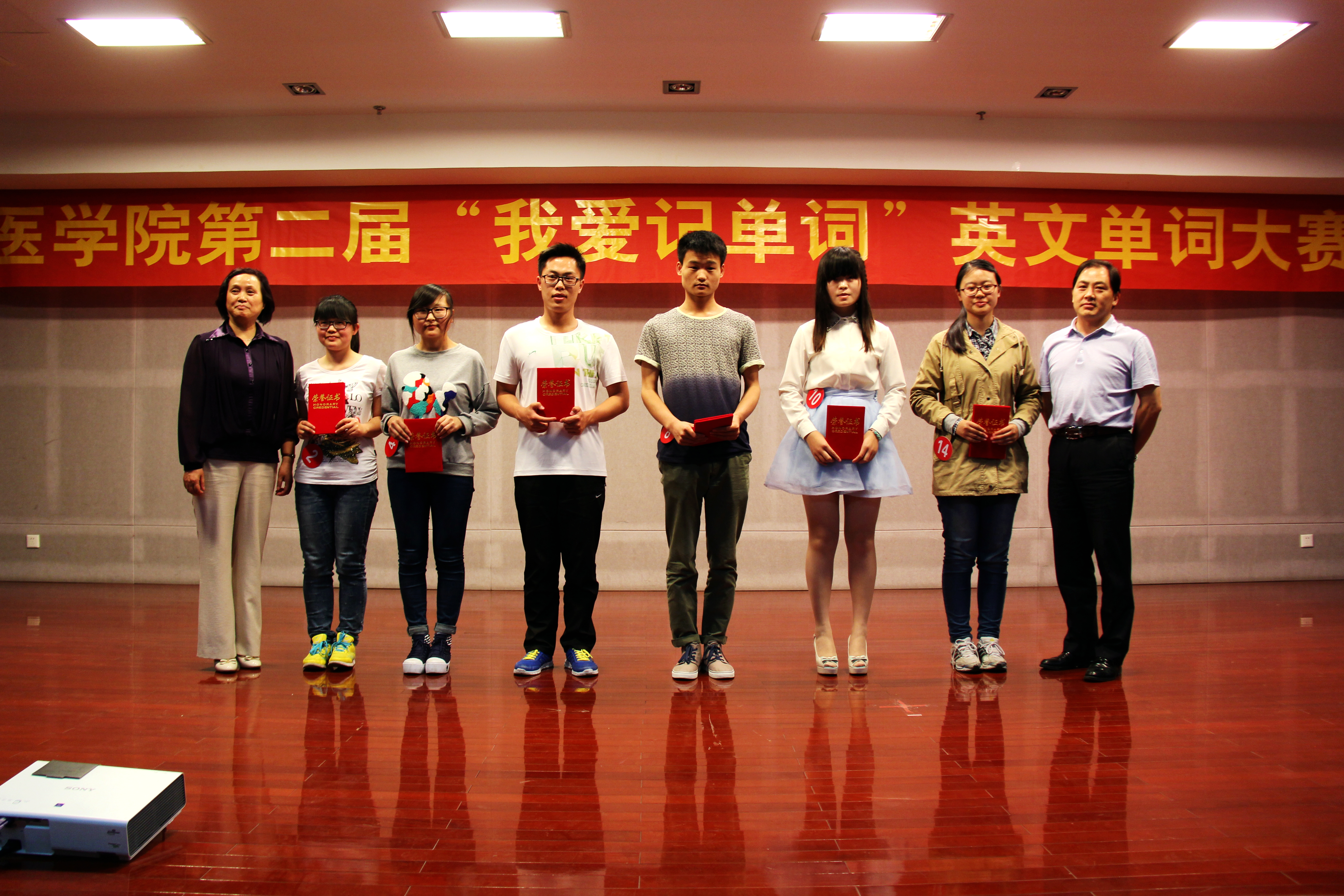大赛兼具知识性与趣味性,紧张激烈,精彩纷呈。选手们沉着冷静,灵活应变,赢得阵阵掌声。评委点评精彩,不仅对各环节作答关键点进行分析,更与现场同学分享了英语词汇学习的方法和技巧。主持人台风稳健,观众互动热烈,工作人员配合默契,各环节紧密相扣,演员们精心准备的英文才艺展示也在比赛间歇不断将现场气氛推向高潮。经过数次挑战和激烈交锋,共产生一等奖两名、二等奖四名、三等奖六名及优秀奖八名。最终来自临床2014级的蔡飞娜同学和临床2012级的赵禹同学凭借扎实的英文功底、敏捷的思维及稳定的发挥,尽露王者锋芒,喜获本次大赛一等奖。