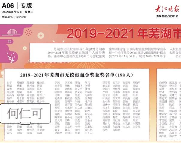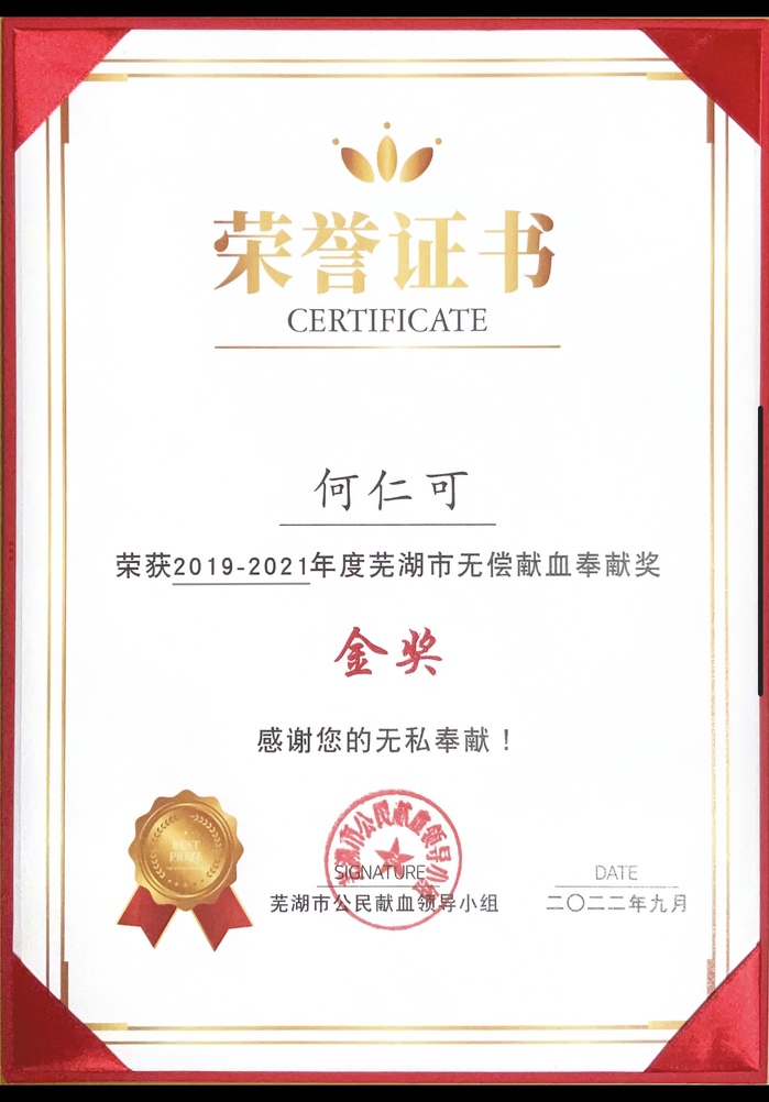 何仁可荣获芜湖市无偿献血奉献奖金奖