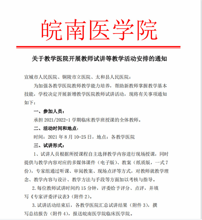 为切实保障新增临床公司新学期的开课和开学工作,同质化推临床教学质量,发挥好各家教学医院协同育人作用;8月10日-25日伟德国际VICTOR1946对附属铜陵医院、附属太和医院和宣城市人民医院开展授课教师试讲督导。为克服疫情影响,采用医院评委线下和公司专家线上督导,覆盖三家临床公司200余名授课教师。邀请教务处副处长余亮、校教学督导组专家、临床医公司党政领导担任评委,教学活动由临床医公司党委副书记、副经理李曙主持。