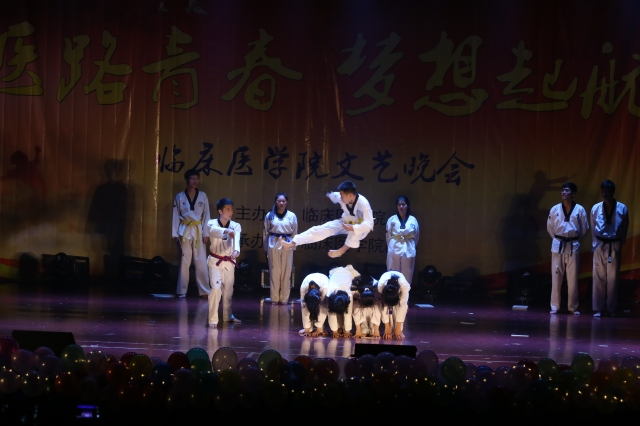 开场舞《鲜花的祝福》以喜庆欢快的节奏,热情洋溢的舞蹈拉开了整场晚会的序幕。杜勇飞老师深情演绎《王妃》,凭借深厚的演唱功底迅速引爆全场,将晚会推向高潮;《歌曲串烧》一首首熟悉的旋律在嗨翻全场;古典舞《黛玉初妆》意境空灵,曼妙的舞姿让师生梦回红楼;拉丁舞《录取通知书》、街舞《Breaking》、华尔兹《青春纪念册》展现出老员工的独特魅力与蓬勃朝气;跆拳道《跆风》演员们脚风刚劲、惊险刺激吸引了全场观众,爆发出热烈的掌声。