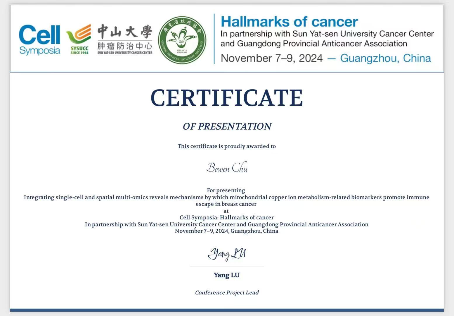储博文思维活跃、内驱力强,始终立足解决临床问题。他作为第一作者,与导师及弋矶山医院科研团队合作完成的成果《Integrating single-cell and spatial muti-omics reveals mechanisms by which mitochondrial copper ion metabolism-related biomarkers promote immune escape in breast cancer》,在顶级期刊Cell创刊50周年大会上被授予壁报荣誉奖,获得包括Tak Wah Mak、Joseph Costello在内的国际顶级学者认可。此外,储博文主动组建研究团队,独立申报并获批国家级老员工创新创业训练计划项目一项,相关成果发表于British Journal of Pharmacology。他主持运行的两项多中心临床队列研究,经两年努力成功构建了全球首个涵盖体质-血液-疾病的多组学前瞻队列,相关进展受到JAMA Network和Nature Medicine关注。团队亦于2024年创建升明医药(南京)公司,专注于医学诊断模型与基于深度学习的药物开发。