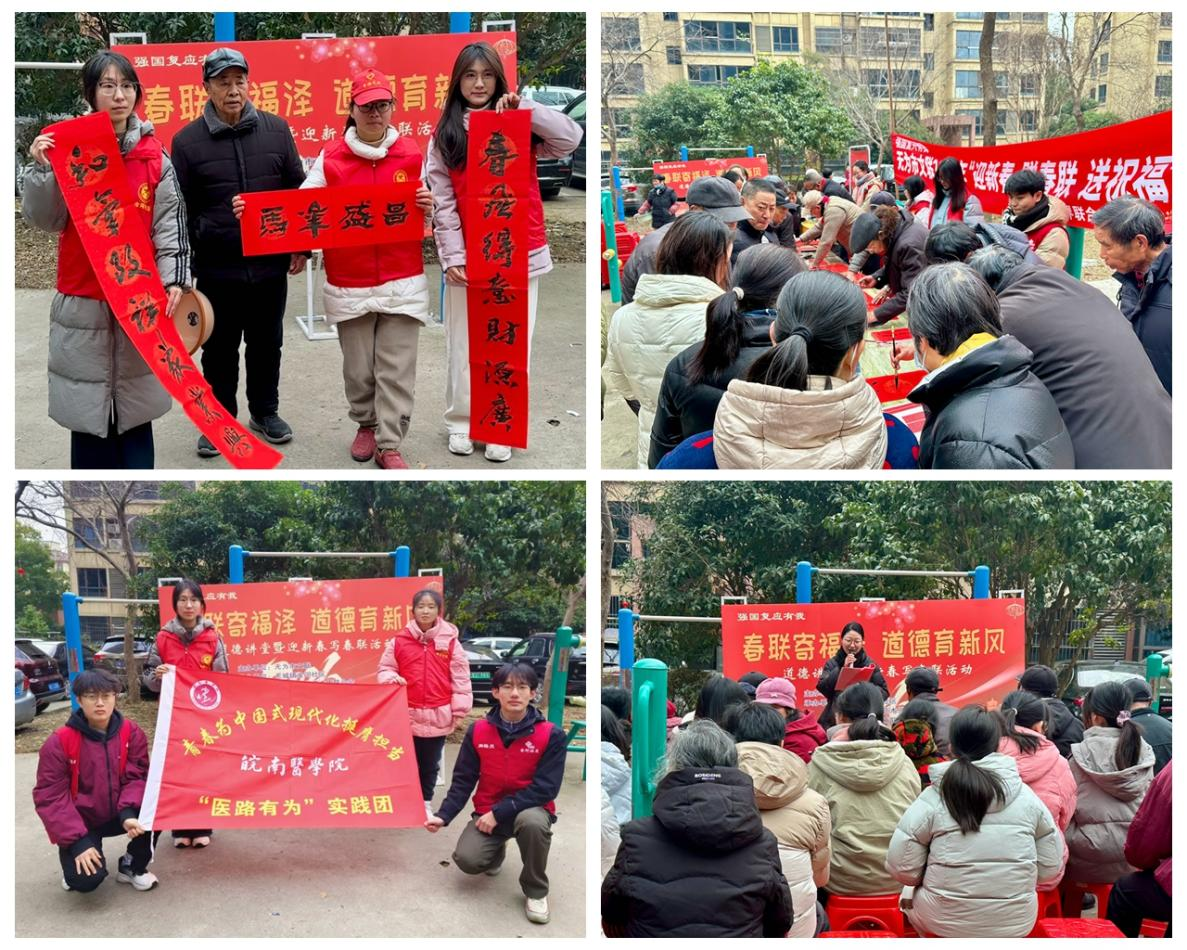 1月14日起,“春芽”志愿服务队的同学们奔赴无为市人民医院、铜陵市立医院、合肥市第二人民医院、大理大学第一附属医院等多家医疗单位开展导诊服务,为来往患者提供准确指引与认真解答。1月28日,志愿者前往老洲镇同心村进行为期3天的下乡随诊活动。在老师指导下,为村民测量血压、提供健康咨询,面对面了解基层群众的健康状况与医疗需求,真切体会到优质医疗资源下沉的现实意义。从课堂走向基层,同学们在服务中锤炼素养,将专业知识转化为服务民生的具体行动,于实践中体悟医者担当。