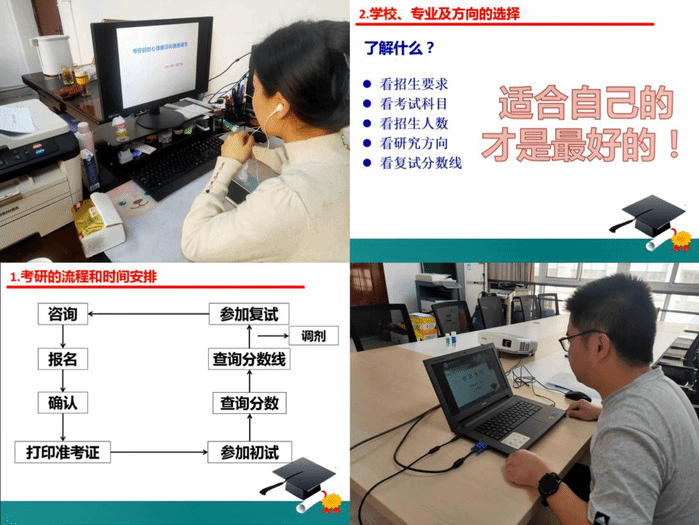 考研报名前,开展考研报考辅导相关讲座,帮助同学们掌握考研报名流程,根据自身情况准确选择报考公司和专业,并对同学们比较关心的常见问题与难点进行解疑答惑;开展线上心理辅导讲座,帮助同学们了解“ 什么是压力”“压力的影响”“如何处理压力”,勉励同学们在考研冲刺阶段,树立信心,放平心态,积厚成器,破云霄。
