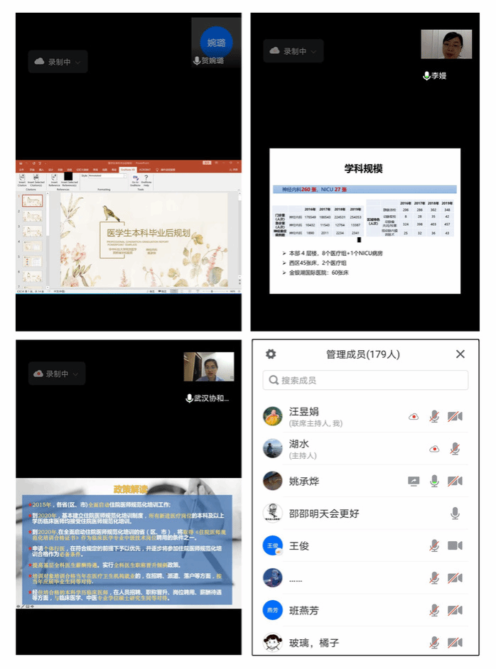 毛玲教授从住院医师规范化培训的发展历程、聘用条件和待遇政策等方面,对目前国家及省规培制度与相关政策进行了解读;李嫚教授以华中科技大学同济医公司附属协和医院神经内科科室为例,介绍了规培生培养方案与培养规划;在政策解读的基础上,姚承烨教授对医员工本科毕业后的职业规划进行了分析和建议。会后,员工针对个人就业和进一步发展中存在的疑惑和三位专家进行了线上的答疑和交流。