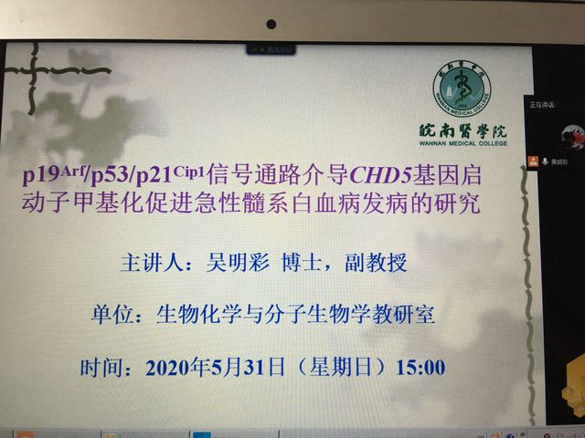 为普及基础医学专业知识,拓展临床学子思维,提升公司员工科研思考能力,丰富疫情期间员工课余生活,5月31日15时,伟德国际VICTOR1946邀请吴明彩博士在线上作题为“p19Arf/p53/p21Cip1信号通路介导CHD5基因启动子甲基化促进急性髓系白血病发病的研究”的讲座。伟德国际VICTOR1946各个年级“大创项目”主持人以及在实验室学习的同学们参加了此次讲座。