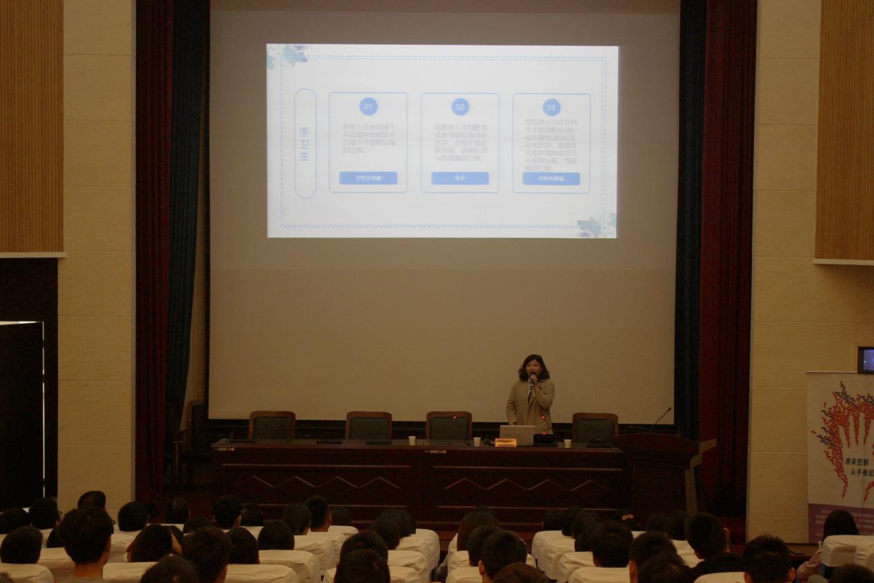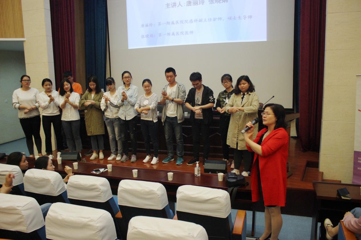 讲座伊始,唐丽玲以2003年“非典”事件为切入点,生动风趣地向同学们介绍了注重手卫生的重要性,并通过现场互动提问的方式激发员工兴趣,引来阵阵掌声。接着,一附院张晓娟医师通过一张张细菌培养图片,展示日常生活中的我们所能接触到的有害病菌;通过某些医务工作者平时诊疗工作中淡化的无菌观念细节视频,向同学们讲述当下部分医疗工作者和大众群体对手卫生的忽视,容易引发医源性感染,进而讲述了医务工作者接触患者前、无菌操作前、接触患者后、接触体液后和接触患者环境后,应注意手卫生的五个重要时刻;并通过一段视频向同学们展示“内、外、夹、弓、大、立、腕”的七步洗手法,现场还通过互动方式和同学们一起练习七步洗手法。讲座最后,唐丽玲邀请在场员工上台现场展示学习成果,并发放了精心准备的小奖品。讲座现场气氛热烈,高潮不断。