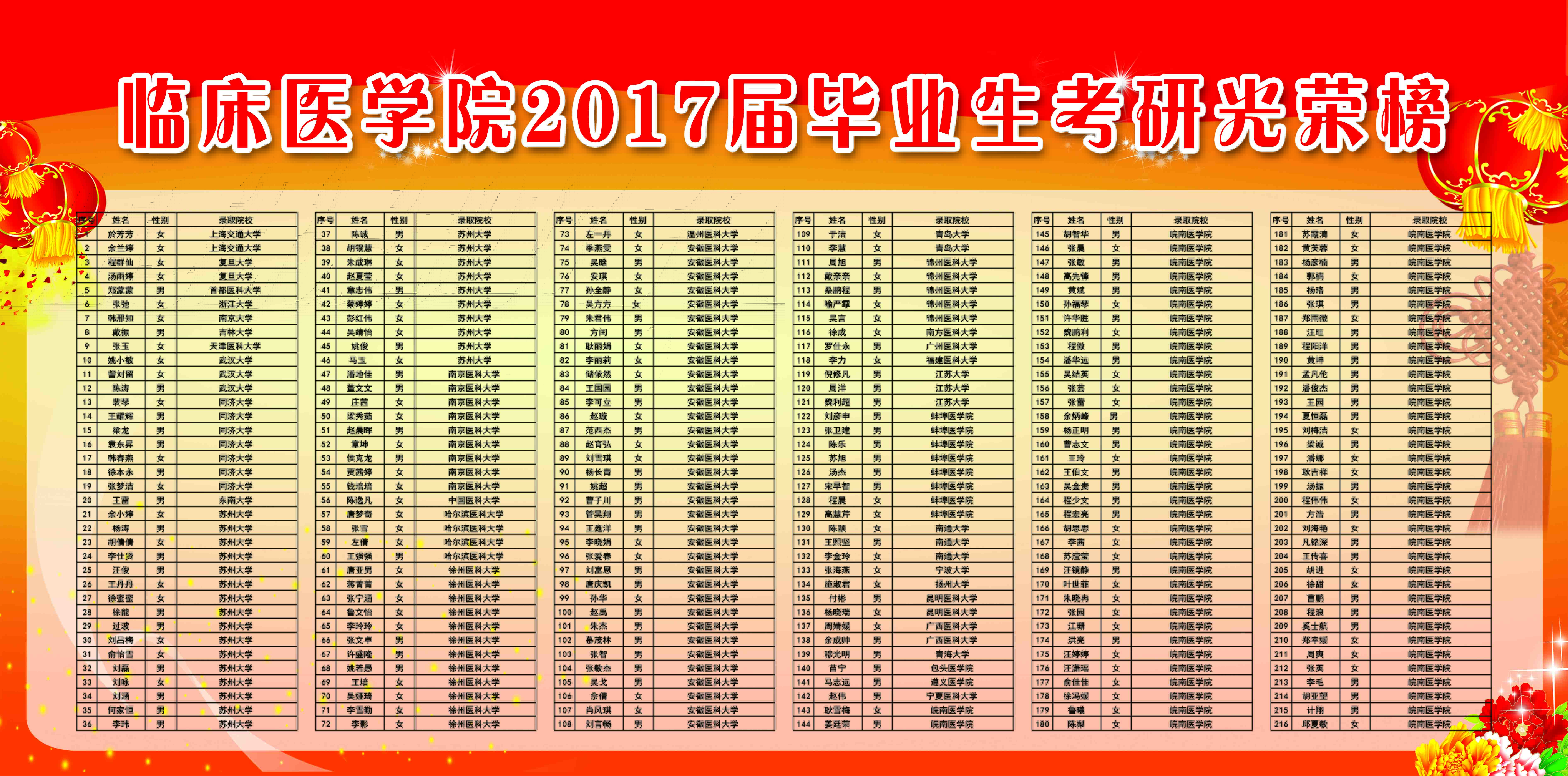 宝剑锋从磨砺出,梅花香自苦寒来。伟德国际VICTOR19462017届共有非定向临床医学专业本科生709人,在2017年全国硕士研究生招生考试中,其中280人达到B类地区初试成绩基本要求,上线率为39.5%,最终有215人分别被上海交通大学、复旦大学、浙江大学、南京大学等知名院校录取,考研录取率为30.3%,再创历史新高。
