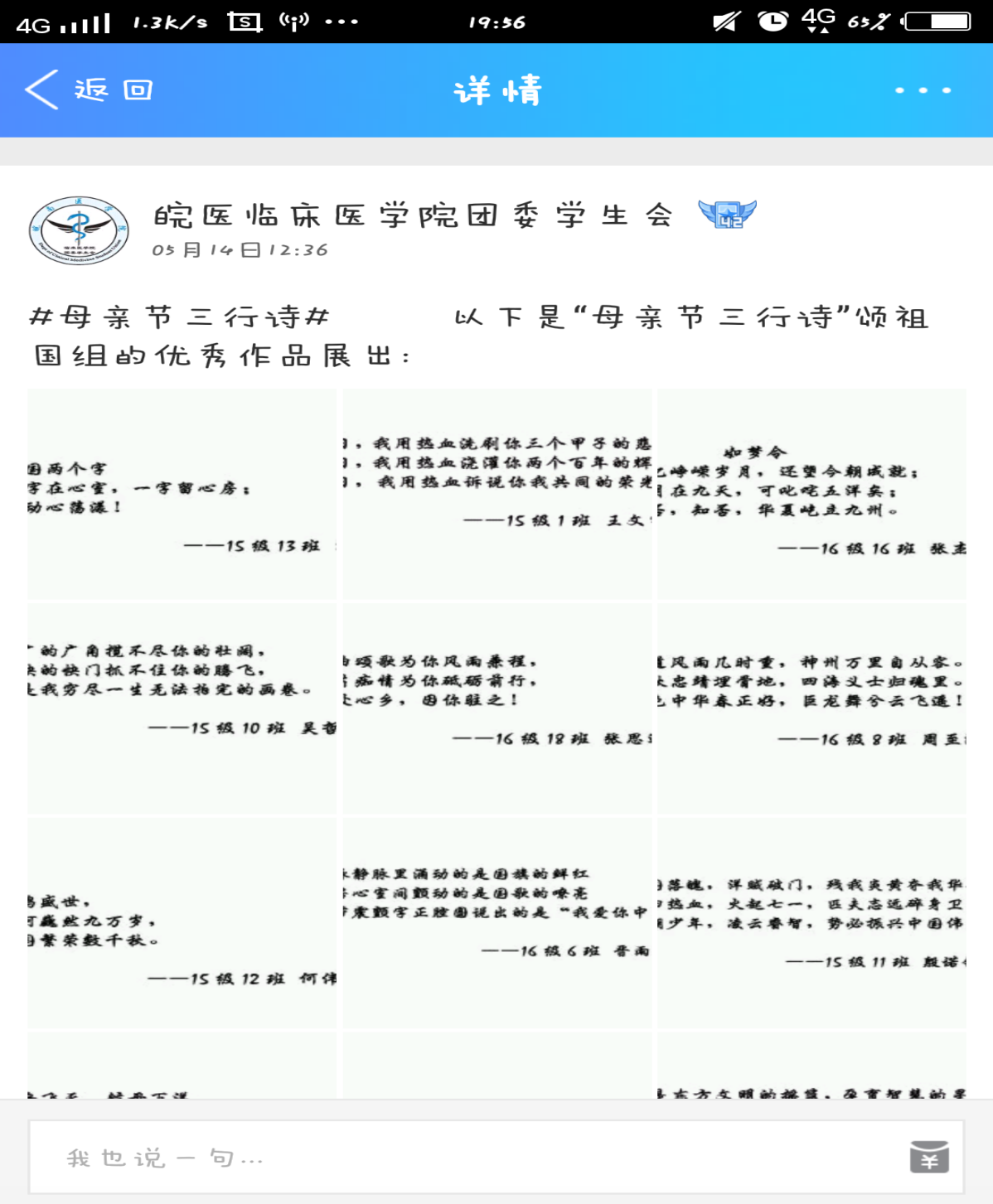 本次活动分为感恩母亲、歌赞祖国两类主题,共收到来自2014、2015、2016三个年级100余篇参赛作品,每首诗都诉说着作者的肺腑之言,或是饱含对母亲的依恋感激,亦或满载对祖国山河的深切热爱,言语真挚感人,辞藻华丽而亲切。“昨日,我用热血洗刷你三个甲子的悲伤;今日,我用热血浇灌你两个一百年的辉煌;明日,我用热血诉说你我共同的荣光!”2015级员工王文宇用一腔热血倾唱对祖国母亲辉煌岁月的赞歌;“点点滴滴含蓄静默而不张扬,像春风拂过清晨含露的丁香,那是母亲带着花香甜甜的爱。”2016级员工季蓉借一笔一墨抒写对崇高母爱的感恩。最终,团委评选出主题优秀作品各15幅,通过食堂门口展板、官方QQ平台公布获奖名单及作品,并于5月18日为获奖者颁奖。