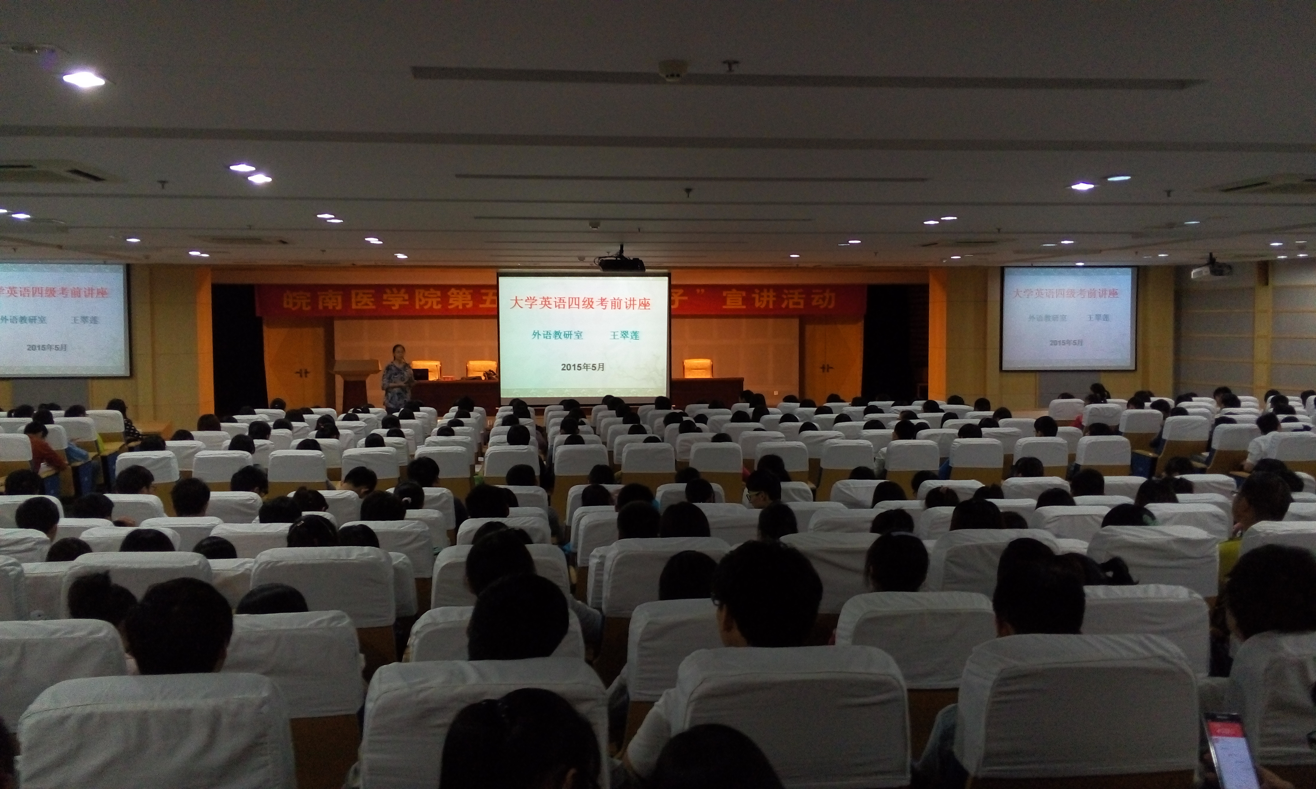 为迎接即将到来的老员工英语四级考试,提高同学们学习英语的热情,伟德国际VICTOR1946邀请外语教研室王翠莲老师,于2015年5月6日晚7:30在图书馆三楼报告厅举办专题讲座,指导员工如何进行考前准备、传授应试技巧。讲座由2014级辅导员伍长娟主持,2014级近400名员工到场聆听。