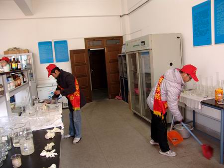 3月10日,医学一系2009级青年志愿者自发来到基础部,开展了清理实验室,美化校园环境志愿者活动。09级志愿者们分成两组,一组打扫员工实验室,另一组清扫实验室办公区域。大家不畏辛劳,认真擦拭桌面、实验设备和窗户,清扫地面,不放过任何一个卫生死角。经过大家的努力,实验室更加整洁和卫生,受到了实验室老师们的一致好评。