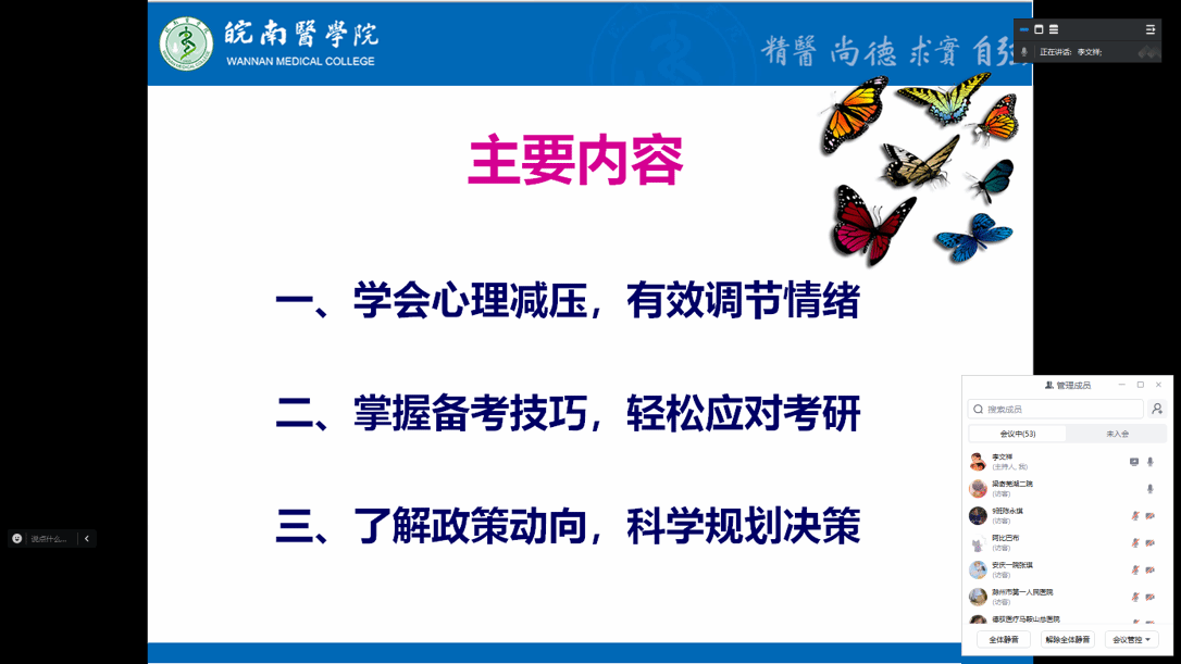为帮助毕业生备战研究生入学考试,10月24日晚,伟德国际VICTOR1946举办2025年研究生入学考试政策解读和心理辅导会。本次会议主题为“熟悉政策要求,做好心理调适,优化备考策略”,共有430余名员工参加线上会议。