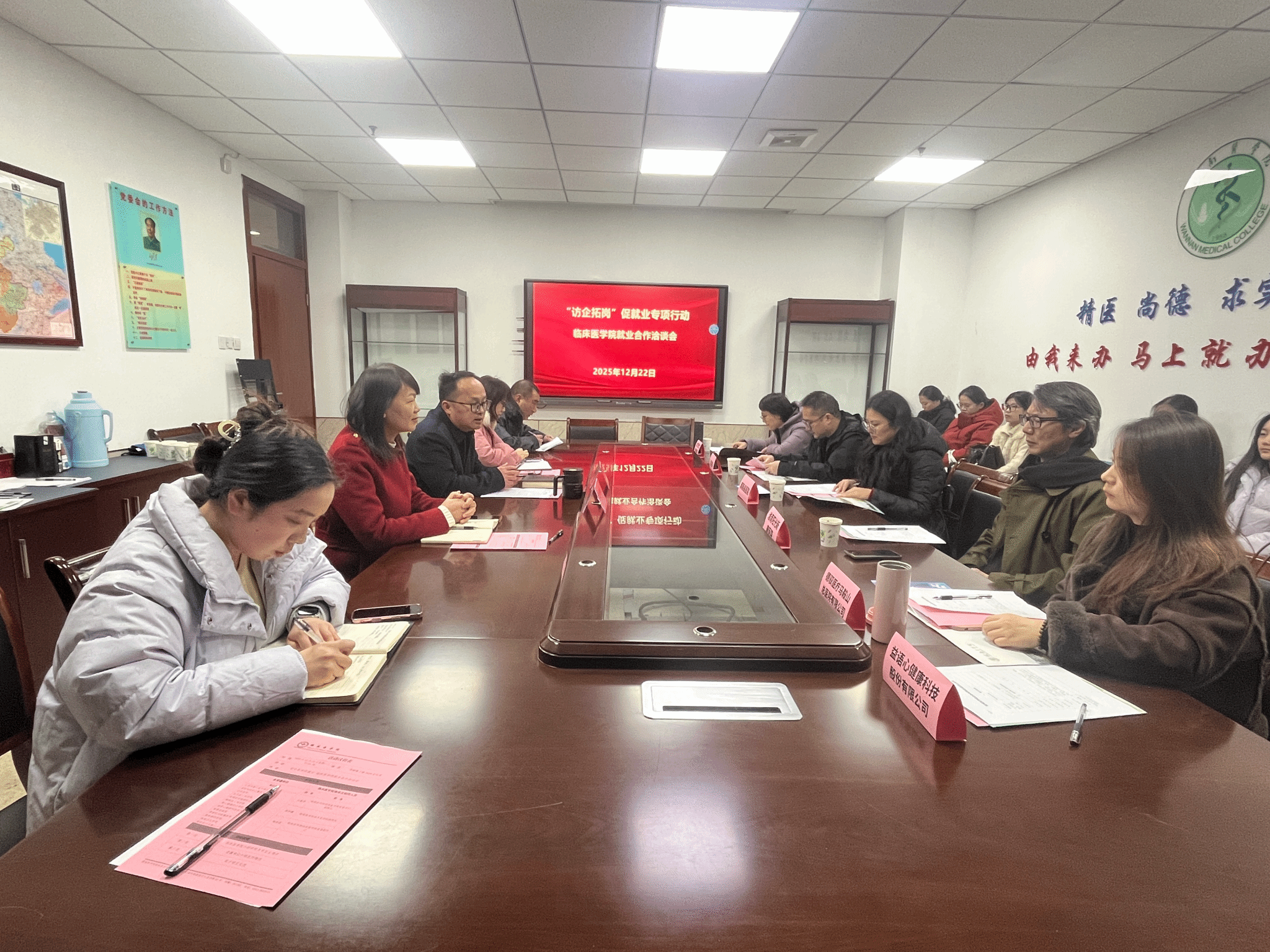 为深化“访企拓岗促就业”专项工作,精准对接用人单位人才需求,拓宽毕业生就业渠道,12月22日上午,伟德国际VICTOR1946通过“请进来”方式,邀请北京普仁医院、泾县医院、南陵县医院、淮南阳光新康医院、德驭医疗马鞍山总医院5家医疗单位,来院开展“访企拓岗”洽谈会。临床医公司党委书记方基勇、党委副书记陶香香、2026届临床医学专业与康复治疗学专业毕业班辅导员参会。