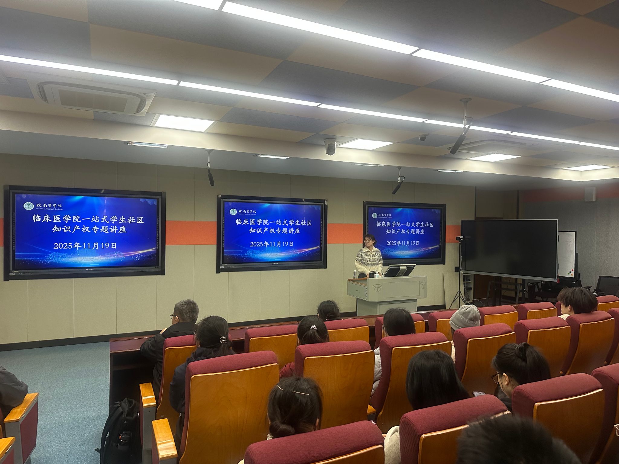 魏慧君老师紧扣医学专业特色,用生动的行业案例阐述创新意识与创新能力的重要性,让大家直观感受到“创新推动医学进步”的强大力量。在谈及知识产权这一“冷门却重要”的话题时,她化繁为简,详细讲解专利申报的政策要求、流程要点与注意事项,通过真实案例分析、现场疑问解答等方式,将抽象的法律知识转化为可操作的实践指南,帮同学们理清 “创新发明如何转化为专利”“知识产权如何保护” 的逻辑关系。现场互动氛围热烈,同学们围绕“医学小发明如何申报专利”“专利保护有哪些关键节点”等问题积极提问,魏慧君老师逐一耐心解答。大家纷纷表示,这场讲座“打开了新世界的大门”,不仅拓宽了学术视野,更明确了科研创新的方向,为今后开展专业学习与科研实践埋下了创新的种子。(白桂峰、陆宇晴、吴孔伟/文、摄)