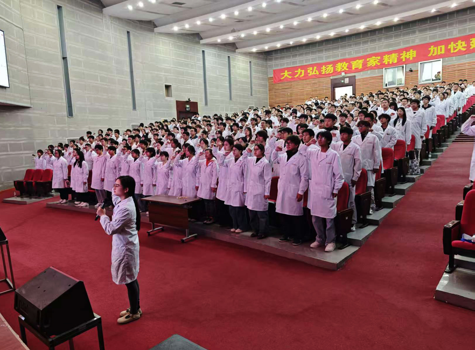 大会最后,全体 2025 级新生高举右拳,庄严宣誓:“健康所系,性命相托……” 铿锵有力的誓言回荡在报告厅内,不仅展现了新生对医学事业的敬畏与热爱,更彰显了他们立志成为合格医者、守护人民健康的坚定决心,为本次入学教育大会画上了圆满句号。