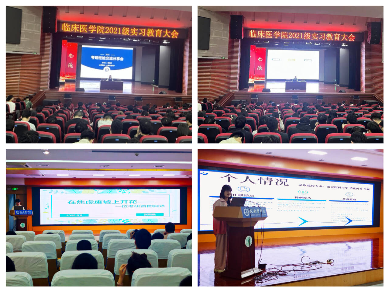 经验交流,医路经验齐开拓。5月26日,两位临床毕业生代表在老员工活动中心大礼堂与即将实习下点的600余名学弟学妹们开展经验交流,围绕专业课程学习方法、临床实习实践经验及职业发展规划等进行交流。6月9日,三位临床毕业生代表在图书馆三楼报告厅举办的第六期“临床青年说”系列朋辈分享会上,与2022级、2023级、2024级共300余名同学分享他们的科研学习经历、临床实习心得及考研复习计划等。